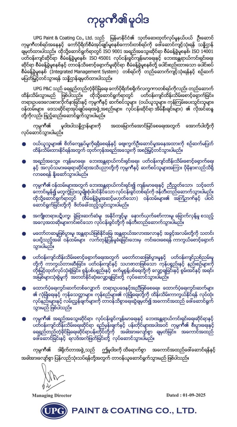 As a leading paints & coatings manufacturer in Myanmar, UPG Paint & Coating Co., Ltd. produces and distributes a wide variety of paint products. The company management and all the line departments including Procurement, Research & Development, Production, Quality Assurance, Marketing & Sales have to stick to the company’s policies, procedures and work instructions directly or indirectly related to the product and service responsibility.