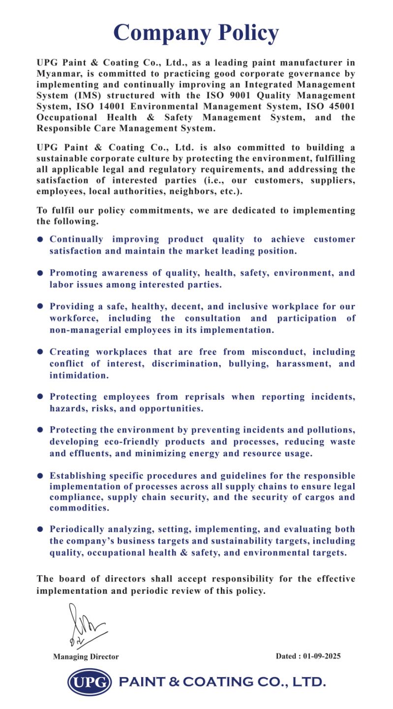 This policy shall be reviewed, updated, and approved regularly by the Board of UPG Paint and Coating Co., Ltd. (UPG P&C).