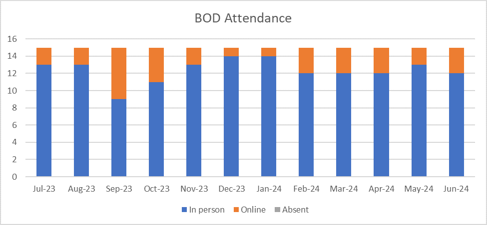 The chart below shows the board member attendance, either in person or via online (zoom). No absence was recorded.